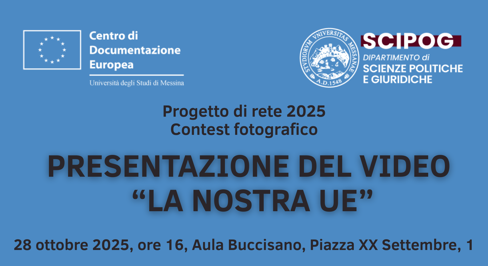 Martedì 28 ottobre alle ore 16 si terrà la presentazione del video “La nostra UE”, risultato del contest fotografico che ha visto la partecipazione di studenti universitari e delle scuole messinesi. Dopo i saluti istituzionali e una introduzione sui contenuti del contest, sarà data la parola a tutti i partecipanti che illustreranno le loro foto e i valori a cui si sono ispirati. Durante l’evento, saranno votate le 5 foto migliori che verranno stampate e affisse nei locali del Dipartimento.